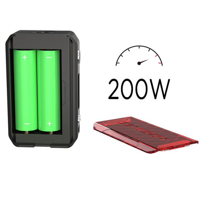 Nach dem 2x 18650er Akkus in den Mod eingesetzt wurden, kann dieser den Betrieb aufnehmen und bis 200 Watt Leistung erzielen. Mit einer Schnellladefähigkeit kann die verbrauchte Kapazität mit 2A geladen werden. Mittels des verbauten Chip-Satzes wird im VW / TC-Ni / TC-Ti / TC-SS / TCR-Mode gearbeitet, bei einer Temperaturspanne von 100°C-315°C und einer Ausgangsspannung zwischen 0.5V-8V. Auf den 0.91 Zoll Display sind alle relevanten Werte klar ersichtlich.