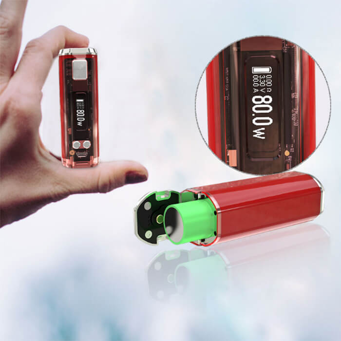 Eine separat erhältliche 18650er Zelle treibt den Mod an. Nach verbrauchter Kapazität wird diese über das beigefügte 2A USB-Kabel geladen, über dem auch neue Firmware aufgespielt werden kann. Die maximale Leistungsausgabe beträgt 80 Watt (100-315℃) / 0.5-9V. Die Benutzeroberfläche ist simpel gestaltet und auch das Ablesen der Werte (z.B. der Modi VW / Bypass / TC-Ni / TC-Ti / TC-SS / TCR) von dem kleinem Bildschirm geht problemlos vonstatten. Zur Sicherheit wurden verschiedene Schutzsysteme installiert.