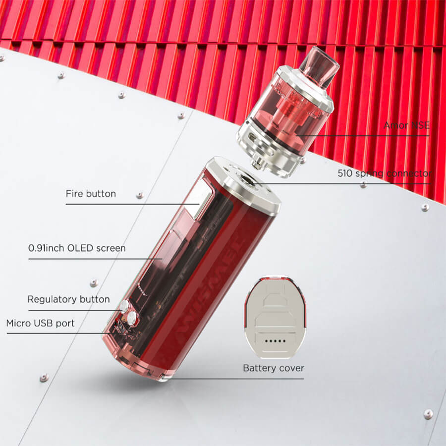 Passend zur kompakten Größe des leicht transparenten Mods, kombiniert ihn Wismec mit dem Amor NSE. Dieser Verdampfer bekommt sein Liquid von oben in den 3ml Tank gefüllt. Wie auch die vorangegangenen Amor Tanks nutzt auch dieser die WS Verdampferköpfe, die ein breites Spektrum an Widerstatt und Wattzahl liefern, so das sowohl Backendampfer als auch Verfechter des direkten Lungenzuges voll auf ihre Kosten kommen.