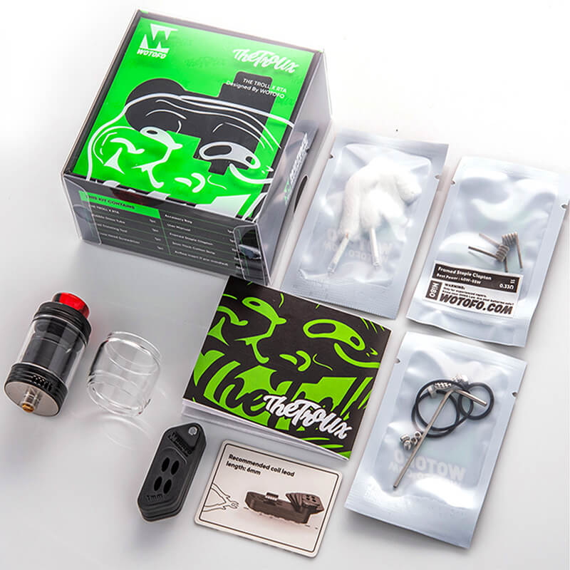 Wotofos Troll X RTA reiht sich in die beliebte Trollserie ein und steht seinen Vorgängern in nichts nach. Dem typischen Erscheinungsbild wurde die Treue gehalten. Er ist in Schwarz, Silber und Gold erhältlich.